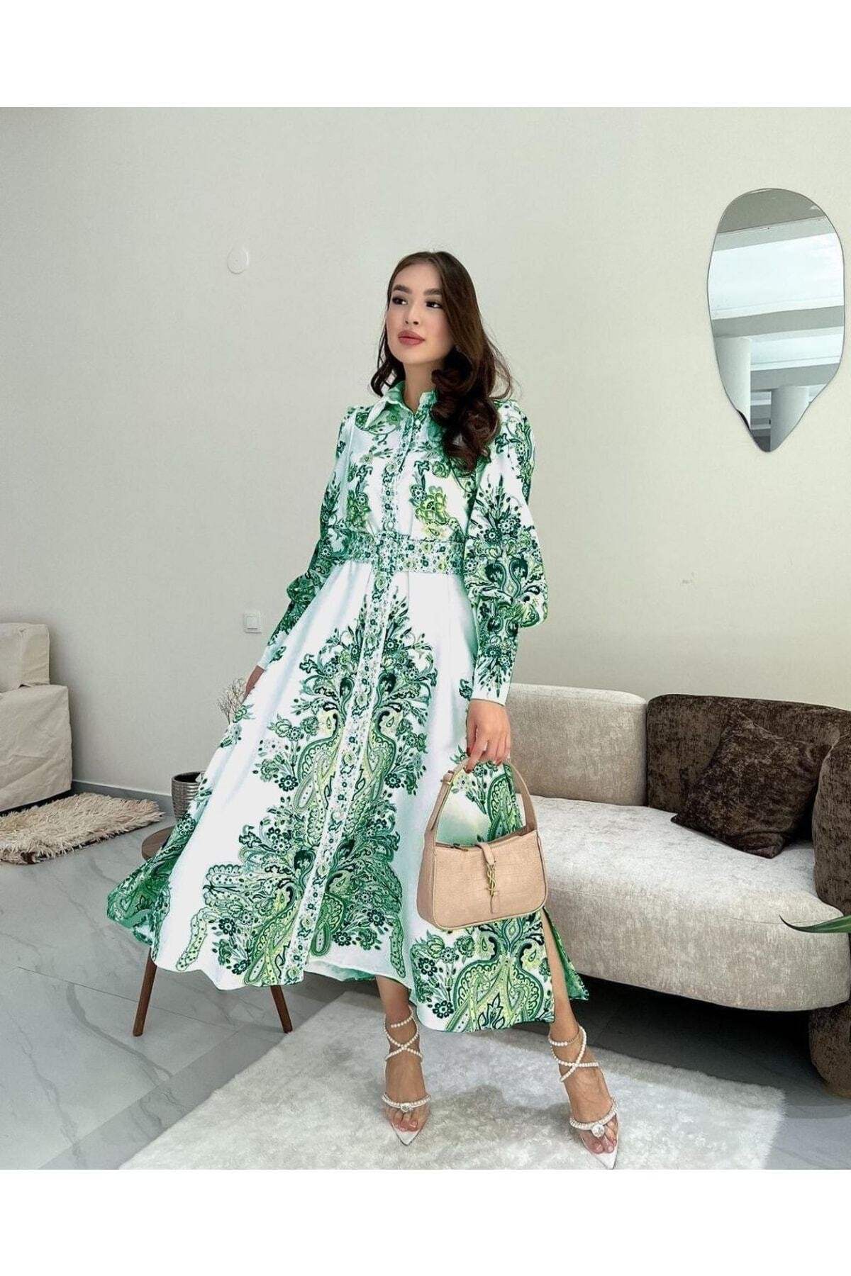 Her yaştan kadının gardırobuna uyum sağlayan çok yönlü tasarımıyla, Atlas kumaş elbise siyah (kemer dahildir) - yeşil, şık ve zamansız bir seçim sunuyor.; Gömlek yakası detayı ile modern ve sofistike bir görünüm kazandırırken, ipliği boyalı özelliği ise dokunuşa ekstra bir zarafet katıyor.; Yırtmaçlı tasarımı sayesinde feminen siluetini ön plana çıkaran bu elbise, gün boyu rahatlık sağlıyor.; Volanlı kol tipiyle klasik ve şık bir görünüm sunarken, uzun kol boyu soğuk havalarda bile sizi sıcak tutuyor.; Gömlek elbise kalıbı ile rahat hareket etme özgürlüğünüzü kısıtlamazken, çiçekli deseniyle doğanın güzelliğini üzerinizde taşıyorsunuz.; Kemer detayı belinizi zarifçe sararak feminen siluetinizi ön plana çıkarıyor ve şık gece ortamları için ideal bir seçim oluyor.; Kalın kumaşı sayesinde dayanıklılık sunarken, dijital baskılı deseni ile canlı renkleri uzun süre koruyor.; Örme kumaş tipi esneklik sağlarken, uzun boyu da bacaklarınızı olduğundan daha uzun gösterir.;